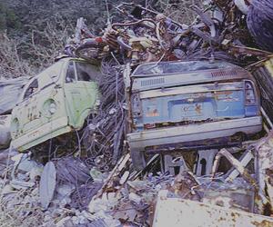 ごみ捨て場にて・・・ 360cc軽自動車や原付、その他色んな廃材が累々と重なるごみ捨て場。 とりあえず判別できるのは左からポーターキャブ、レックス360、キャリィ、サンバー5ってとこかな。このほかにもまだまだ360軽がたくさん埋まっているのだが、「ごみ捨て場」だけ有って、ごみ同然にボロボロになったものばかり。 ポーターキャブは今でもよく見かける三菱のエンジンを積んだモデルではなく、マツダ純血モデルだった頃の2サイクルエンジン搭載車(厳密に言えばブリヂストンの息がかかっているのだが・・・)。 同タイプのポーターキャブを以前使っていた事が有り懐かしい。メーターパネルのデザインが、キャロル(平成版ね)と同じ様な意匠だった。 レックスは私が持っているレックスと同じ2サイクルエンジンのカスタムLなのだが、さびさびで部品取りにも使えそうにない。 3年ほど前に見に行ったときは、リアガラスが未だ健在であったが最近見に行ったら割れてしまっていた。 上の写真のどこかに三菱ミニカが隠れている、ミニカを探せ!。 |