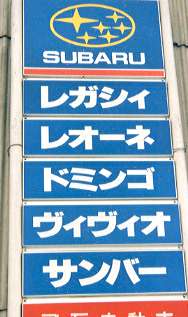 | 看板 販売店、修理工場などでおなじみの立看板。 この手の看板では新名称の新型車が登場しても、旧車種の名前がしばらく残っていたりするものだが、スバルの場合「レックス」はヴィヴィオ登場と同時に一斉に取り外されて見られなくなった。 この写真はインプレッサ登場直前に撮影した写真。「レオーネ」のケースについてはよく覚えていないが、さすがに今でも残っているものは少ないだろう。 一番上のスバルマークだが、現行のスバル車に取り付けられていないのは皆さんご存じの通り。 富士重工は過去の傑作車「スバル360」や、「スバル1000」をよく現行車や企業イメージの宣伝に使う。 そういう風に先人の遺産を最大限に使うのなら、そのシンボルであるこのマークはもっと大切に扱うべきなのでは? 先年「スバル」シリーズの生みの親、百瀬晋六氏が他界され、昨年にはスバル六連星のマークをデザインされた佐々木達三氏も亡くなった。両氏はスバル車からこのマークが消えたのをどう思われていたのだろうか。 | |