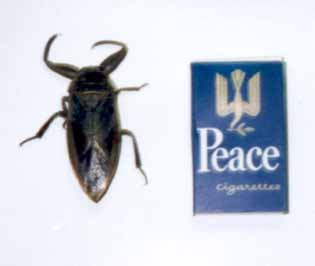 たがめ 私が子供だった昭和50年代、私達の遊び場であった川は田舎にもかかわらず、余りきれいではなかった。 私の住んでいた地区では下水道が整備されておらず、し尿以外の排水はすべて川に放流されていたからである。 それでも夏になると川で泳ぎ、魚を採って遊んでいたものであるが、子供の頃一度も見かけたことがない虫が、最近になって見かけられるようになった。 それがこの「たがめ」。 どうやら近年下水道が整備された事や、農薬が変更されたことなどにより復活してきたらしい。 写真のたがめは体長約7センチ、これが襟元に入り込み大騒ぎした人がいた、はっきりいってこの位の大きさになると恐い、事実かみつかれると恐ろしく痛いのだそうである。 兵庫県のナチュラルウオッチャーとかいうボランティアに登録している知人が、この写真を基に「希少動物の生息場所発見」として兵庫県に報告したそうである。(1999.10.6) |