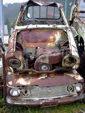これは難しいかも。 原型をとどめていない上、どこを探しても車名を示すエンブレムや銘板の類がなく、しばらく判断がつかなかった。 結局ヘッドライト周りと、フロントフェンダーのプレスラインを材料に判断したのだが・・・。 |