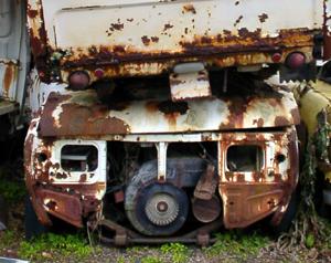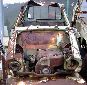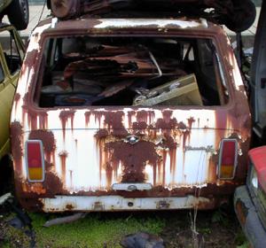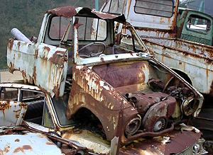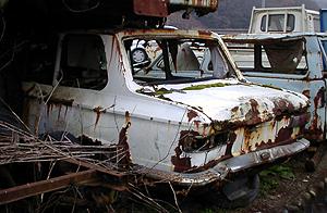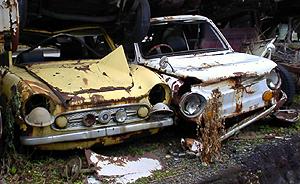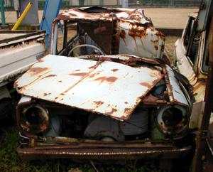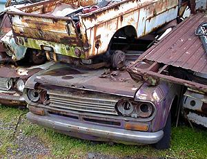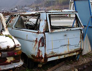 スバルR-2・スズキフロンテ 好敵手としてならした両者、どちらも目玉が飛び出しているのが痛々しい。 フロンテはピラーがかなり曲がっており、今にも潰れそう。 写真では見えないが、フロンテの上に乗っているのは初代アルト。 後輩の重みで潰されるのも時間の問題か。 |
