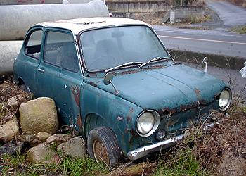 スバルR-2 ライトリムやフェンダーモールの痕跡が有ると言うことは、スーパーデラックス・グレードだったのだろう。 白と濃緑のツートン塗装になっているが、いずれも純正色で似たような色があったはず、とすると純正色の上にいずれかの色を重ね塗りしたのだろうか。 テントウムシにはトップのみを白や黒に塗装したものがよく見られたが、同様の塗り分けをR-2にするとちょっと・・・。屋根がへこみゴミと雨水がたまっている。 でもまあ後ろから撮った写真では、結構「さま」になっているような気がしなくもない。しかしこのアングルから撮影すると正に「あの」クルマにそっくりですな。 ところでこのクルマナンバープレートが付いたままの状態であった、税金払わずに滞納しているのかなぁ・・・。同様なケースはよく見かけるが、人ごとながら毎度心配してしまうおせっかいな私。 (2000.2.20) |