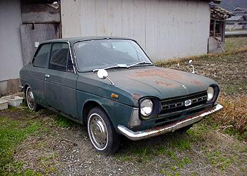 スバル1100 遠目で見た際は一瞬「レオーネ?」と、見間違えてしまったのだが、近寄ってみればスバル1000シリーズの最終型。 塗装は荒れていて下回りには錆も出ていたが、なんとなく近年まで動いていたような雰囲気。 ホワイトリボンタイヤは新車時からのものだろうか? スバル1000シリーズの最終型(1300G・1100)といえば、初期型のシンプルな顔から一転、ワイルドなグリルデザインを採用した。この顔が好き嫌いのハッキリする顔立ちなだけに、一般に今ひとつ評判がよくないように思う。私もその一人。 だが実車を目の前にしてみると、それほど違和感が無いというのが私の印象である。もっともこれは濃緑色のボディカラーによるイメージなのかもしれない。黄色や白のボディカラーだったらあまり似合わないかな・・・。 この時期のスバルFFシリーズは排気量1300ccと、1100ccの2本建てになっており、それぞれが上級グレードと、ベースグレードをカバーする形をとっていた。 外観上ではグリルのスバルマークの形状が違うこと、前面のウインカーレンズがオレンジか白かにより見分けられる。(写真の車は白なので1100タイプ) (2000.2.20) |