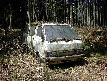 サニーバネット 林の中寂しく放置されているこのクルマ、降り積もった杉葉が土になり、草だかコケだかが無数に生えている。 放置場所は近に人が立ち入った形跡が認められない、なんとも寂しいところ。普通の人は絶対立ち入らないような所である。 私がそんなところにまで立ち入ったのは、云うまでもなく私が「普通の人」ではないからである。 この写真を掲載するにあたり、辞典で「VANETTE」という語をひいてみたが、残念なことに該当なし。 自動車雑誌やら図鑑をひっくり返して調べてみると、「VAN」に「小さい・かわいい」という意の接続語「ETTE」を組み合わせた物だとか。 どおりで辞典で見ても分からないはずだ。 これと同じ経験はトヨタパブリカでもしている、「PUBLIC」+「CAR」なんてわかんないすよ・・。 そういえばチェリーバネットなんてのも有ったがどう違うのだろう、多分名前だけなんだろうね。 バネットセレナ、バネットラルゴ、単体のバネットなんてのも有りますなぁ・・。(2000.5.19) |