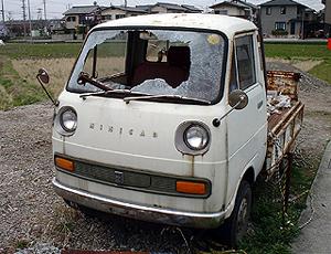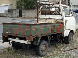 | 三菱ミニキャブトラック つくづく緊張感の無い顔付きですなぁ、前半分は正統派草ヒロなのだが、後ろ半分、荷台部は不気味な塗装が施され、ただならぬ雰囲気を漂わせている。 しかしなんで迷彩塗装なの?キャビンのみオリジナルの塗装を残している意味もよく分からない、案外洒落で塗っている途中ペンキが無くなったから・・、なんていうのかもしれない。まさか自衛隊の払い下げではあるまい。 | |