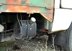 実にかわいらしいガソリンタンク、容量2リットル、航続距離40キロというところかな。 ・・というのはもちろん冗談ですぜ旦那。 多分2サイクルオイルのタンクです、鍵なしのキャップと、樹脂製(ビニールチューブ?)のレベルゲージが泣かせる。(2000.8.13) |