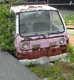 不気味な色で塗り分けられたミニキャブトラック、営業車としての塗色なのか、オーナーの趣味だったのか・・?