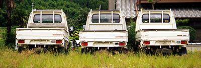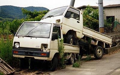 | 意味深なミニキャブ 乗りかかるように放置されたミニキャブ、以前同じ状態の草ヒロ写真がノスタルジック・ヒーロー誌に掲載されていたが、投稿者のコメントとして「なんだかいやらしい格好の草ヒロだなぁ」という一文が有った。 そうするとこのミニキャブも「いやらしい」のかも知れないが、なぜ「いやらしい」様に見えるのか私にはよく分からない。もし知っていたとしても、高潔なる当所の風紀を乱すような解説を行うわけにはいかない。 「いやらしい」云々はともかく、すこぶる不自然な状態で放置されているこのミニキャブ、どちらも同じ型のミニキャブなのはなにか因縁が有るのだろうか?わざわざこんな形にする理由も理解できず、謎だらけの一枚。 |
