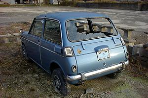 お馴染みホンダの名車、ホンダN360。 前々から目を付けていたクルマなのだが、いつの間にかリアガラスや、テールレンズが割られてしまいこの有様に・・。 貴重なツーリング・スポーツとかいうグレードなのにね。 オーナーもいたずらに閉口したらしく、この後しばらくしてどっかに行っちゃいました。 |