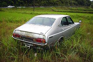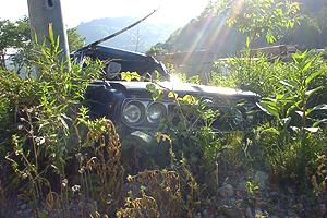 広い、広い、野っぱらの中に放り出された初代バイオレット。 なんともかんとも不思議なシチュエーションで有る、ボテッっとしたスタイルが今ひとつ好きになれなかったバイオレットであるが、現車は割と綺麗なクルマだっただけに少し惜しい気がした。 周りの草むらは足を踏み入れると水がしみ出してくるような湿地で有り、早く救出しないと湿気でグサグサになりそう・・。 ちなみに私はゴム長靴を持参していたので、情け容赦なく近づいて写真を撮ることが出来た、草ヒロ探訪に長靴、これオススメっす。 |
