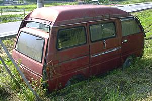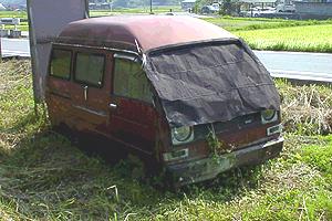 このタイプのミニキャブはグリルのタイプをとってみても何種類かが有るようで、全部は把握仕切れていない。 上で紹介したハイルーフ仕様、またこちらのメタリックカラーからも分かるように、乗用ユースに主眼をおいたワンボックスが登場し始めたのはこのころからだろうか。 しかしまあ雨に濡れているとは云え何とも形容し難いカラーですな。 余談ながらこの写真を撮る際に、深い水たまりに足をはめ込んでしまいズボンまで泥水だらけになってしまった。 これも試練なのか・・!? とりあえず田圃の用水路で靴とズボンを濯ぎ、果敢に次の目的地へと向かった私。 我ながら全くショーキの沙汰じゃねぇなぁ、というボヤキはさておき、そこまでして撮った写真。十分味わってちょーらいね。(笑) |