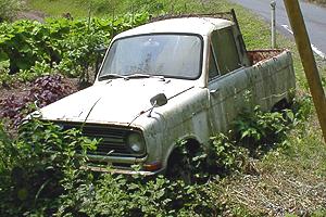 | 三菱360トラック 三菱360とはまた味気ないネーミングで有るが、これが正式な愛称。 みなさんご存じの通り、初代ミニカのベースにもなったモデルである。 今の感覚からすると荷台が実に小さく狭く見える。正直な所これで実用性が有ったのだろうか・・?と考えざるを得ないレベルである。でも当時は「クルマが有る」という事だけでも価値が有ったんでしょうな。少なくともリアカーみたいに人力で引っ張る必要は無いのだから、やはり「クルマが有る」という事は画期的な出来事だったのかもしれない。 現車は末期型とおぼしきモデル、前文とだぶるが実に可愛らしい雰囲気で、事情が許す物ならお持ち帰りをお願いしたい位であった。 写真ではわかりにくいが、運転席側にのみヘッドレストが付いているのが面白い。 |