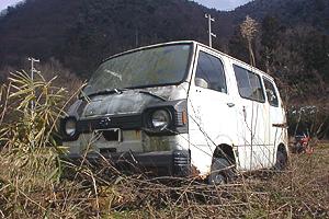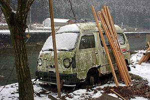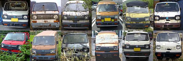 | グリル無しサンバー第三弾、文句なしこれが一番「恐い顔」。 無意味な赤色のペンキに、ブリキ板の目張り。好き者の私にとって最高の題材と言うべき代物か。 | |