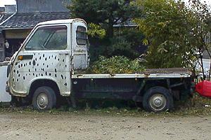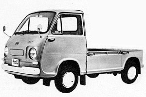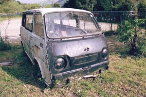 | 2代目サンバーの再末期モデル、「すとろんぐサンバー」なる名前を賜り、どでかいライトグリルを付けている。(前からの写真が撮れなかったのが残念) 上のモデルと比べると、ドアが前ヒンジの一般的なものとなり、屋根に取って付けたようなサイドウィンカーは、ベンチレーター(空気穴とでもいうのかな)と一体化したデザインに変更されている。 な・の・に、ホイールキャップはスバル360の富士山キャップ! | |