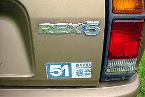 エンジンフードにはレックス5のオーナメントと共に、51年排ガス規制適合のステッカーが付く。 メーカーさんもあれもこれもと、色々とアピールする事が多くて、大変なんです。 REXのロゴの字体で有るが、この次のレックス550からは字体が変わり、660ccの代に至るまで使い続けられる事となる。 というか、登場時から2種類程の字体が混在していた模様。 |