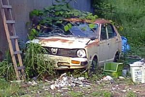 レックスバンの姿、 お分かりになりますかねぇ・・。 私が高校生の頃(10年くらい前)までは動いていたクルマのナレの果て。 坂道を上る時など爆発・分解するんじゃないかと思うような爆音をあげていたのが懐かしい。 |