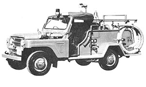 ニッサンファイヤーパトロール オールドタイプの消防自動車として、すっかりお馴染みの一台。 自治体消防団、企業の自警消防隊にはまだまだ結構な数が残っているようで、余所のサイトでも多数紹介されている。 ドアのないオープンデッキが標準の形らしいが、寒冷地ではキャンバス張りの簡易扉が付く。開けっぱなしじゃさすがに寒いからね。 |