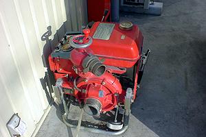 マニア感涙物の「ラビットマーク」、この他にも持ち手のゴムグリップにうさぎちゃんマークがモールドされていたりして、マニアにはたまらん訳ですよ。(なにが!?) また前面パネルには「RABBIT FIRE FIGHTING PUMP」(すぺる、合ってるかな?)なんて書き込まれているが、火と闘ううさぎちゃん、ファイャー・ファィチィング・パンプなんて所に、男のロマンを感じてしまう訳です。 |
