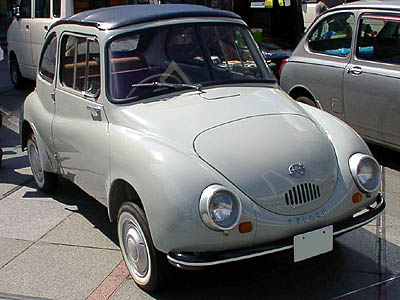 | みんな知ってる日本の名車スバル360。 以前は懐かしい、可愛いというイメージばかりが先行したように思うが、NHKの人気番組プロジェクトXでとりあげられた事もあり、本質についても知名度が上がったことが喜ばしい。 スバル360についてちゃんと知りたい方は、検索すると詳しいサイトが沢山見つかります。(このサイトは役に立ちません) 冒頭に掲げた写真は初期のデメキンと称されるスバル360、平成12年神戸のイベント会場で撮ったもの。 後期のタイプを見慣れた目には、異質な感じを覚えるがこれがオリジナルの姿。 ワイパーが一本であったり、サイドガラスが引き違いのスライドガラスタイプであることが目に付く。最も初期のタイプになるとフロントバンパーの形状も変わるが(2分割タイプとなる)、写真のモデルでも相当に珍しい希少なタイプであることに変わりない。 |