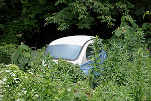 草むらに埋もれ、頭だけ見えてるスバル。 トップがハゲアタマに見えるのがご愛嬌。 ビニールシートが掛けられていたらしく、復活待ちか、部品取り車か。 |