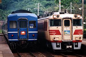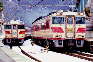 ![]() 梁瀬駅 特急「北近畿」号と交換する「あさしお」号、「あさしお」廃止2日前の撮影。 |