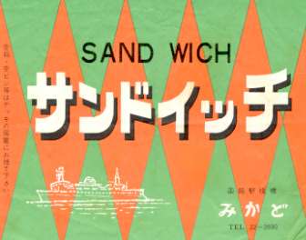 函館駅で買ったサンドイッチの包み紙・・・ なるぺくお金を浮かせるためこんなのばっかり食べていた。 連絡船の絵が載っている、右下には「函館駅桟橋 みかど」の文字が見える。 | ||