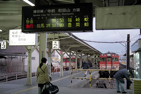 このホームは播但線を発着する列車の殆どが利用するホームで、山陽線のホームとは違ったローカルな雰囲気が漂い、いつもディーゼルエンジンの音が聞こえる私の好きな場所であった。 最近のディーゼルカーは直噴エンジンになったせいか「カラカラ」という軽い音がするが、ここの車両は「ゴロンゴロン」といういかにも眠たげな重苦しい音がする。旧世代の私には国鉄式の「ゴロンゴロン」の方が好き。 何台もディーゼルカーが停車していると、風向きによって灰色の排気ガスがまとわりついたりした。 現在は播但線姫路−寺前間が電化されたため、このホームにも架線が張られ電車が発着しており、このような体験も昔話となった。 他に西側に姫新線の西1番乗り場があるが、規模的に小さいのでちょっとものたりない。 |