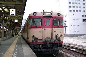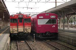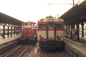 電化開業直前、103系電車の試運転が繰り返されていた。 キハ58が遠慮がちに停車している様に見えた。 |