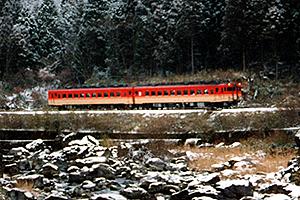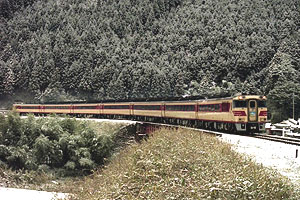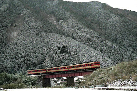 雪の渓谷を行くキハ58の2連。 元は急行型という役者故、ローカル線の2両というのは、いささか寂しい。 |