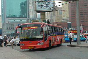 トロリーバス 大連駅前に入ってくるトロリーバス。 初めて見る代物で、架線と繋ぐ集電ポールの動きが実に興味深く、思わず見入ってしまった。 |