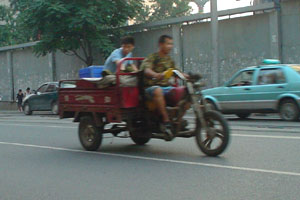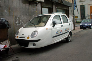 3輪乗用車 上で紹介したタクシー3輪車よりも新しく、洗練された感じの3輪車。 タクシー以外、自家用車として使用されているもあるようだが、さらに数は少ないように思えた。 既に書いたが、交通の流れが速く乱暴なので、なりが小さく、いかにも不安定そうなこの車の走っている様子は、見ているこっちがハラハラする。 |