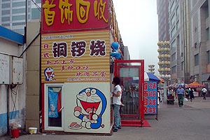 日式 銅鑼焼 これは私にも分かるぞ、読めるぞ、ドラヤキだ。 繁華街で見かけたドラヤキ屋さん、店舗のスピーカーからは日本語の歌「とってもだいすき・・」という例の歌が流れていた。 にぎやかな繁華街でもゴミがあまり落ちていなかったことが印象的。これは緑とオレンジの上下、背に大連市と書き込まれた制服を着込んだ清掃人が至る所で働いており、この人たちのお陰らしい。 市街地ではかなり頻繁に、ハイウェイの上でもゴミ拾いをしているのを見かけた。 |
