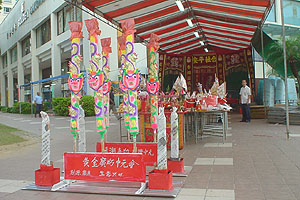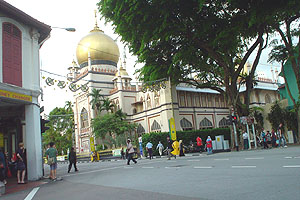 | イスラム風の建物。 やっぱり寺院なのかなぁ、異国情緒を感じて何気なく撮った写真であるが、それ以上の興味はなく、近くに寄ってみることさえしなかった。 道行く人は肌の黒いインド人と思しき人が多かった。 あとは中国系の東洋人と西洋人。多民族国家シンガポールは、多種多様な人種が共生している・・、らしいが、私の国際知識では民族を見分けることすら無理で、このように大雑把なくくりとなってしまう。 それでも眉間にマークを付けた女性(ヒンズー教徒の宗教的な意味のある印=ビンディ)や、スカーフをすっぽりと被り、髪を隠したイスラム女性の姿を見て、それだけでも異国情緒を満喫することが出来た。 訪問前日がシンガポールの独立記念日だったとかで、町のあちこで飾りつけが見られた。 下写真は、私にとってイメージ通り、いかにも分かりやすい中国風の色彩が施された飾りつけ。 | |