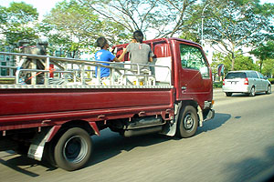 | ダイハツデルタトラック これはちょっと変り種なのかな。トラックは上でも上げた、キャブスター、キャンターのほか、ライトエースに似たキャブオーバートラック(韓国車?)がぽつぽつ。後は忘れた。 日本の屋号が書かれたクレーン車などを数台見かけたが、中古車の市場もあるのだろうか。 一度トレーラートラックに載せられた戦車を見かけたが、さすがにカメラを向ける気にはならなかった。 あー、あと椰子の葉陰に十字星を見たかったのだが、東西南北すらあやしく、オリオン座くらいしか見分けられない私では、いざ空を見上げて見てもよく分からんかった。 | |