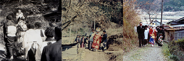 | 私の父は四人兄弟、この四人が順に結婚した際の写真が我が家に残っているが、それぞれの写真を見ていると、昔ながらの雰囲気と、その中でも時間の流れの感じられる点がよく見受けられて面白く思ったので、順に紹介していきたい。 三十年から、四十年前の、日本の田舎のごく平凡な家庭の嫁入り風景の写真である。 |