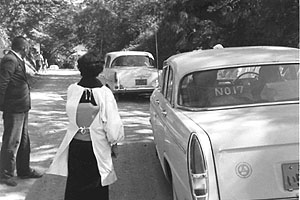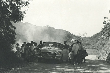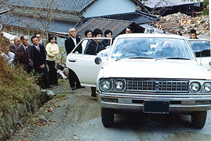 昭和51年11月 使われている車は新旧のニッサンセドリック、ひと目で分かるように通常のタクシーに使われているスタンダードグレードで、車両自体もハイヤーではなく、流しに使われている通常車両。そもそもこの街にはハイヤーなどというものがないので仕方がない。 扉の社名表記が、テンプレートを使った簡素なものであるところもほほえましい。 上から順に、乗降場所が変わってきている。 最初は県道のど真ん中、次は県道の路肩、そして今回は県道から支線に入った町道が乗降場所。ここは急な上り坂になっている場所で、花嫁さんはさぞかし乗降に困ったことだろうと思う。最初に乗降に使っていた県道は見通しが悪い場所で、この頃になると田舎とはいえ交通量も増えてきており、車を停めることも難しかったのだろうと思う。 その後は三人の子供に恵まれ、いずれも結婚して新たに家庭を持ち、孫にも恵まれている。 新婚旅行はハワイ。 この結婚式については、私が四歳のときであり、断片的ながら記憶が残っている。その記憶とは、宴席時の机にあったクッキーのこと、いくら食べても誰にもとがめられず、気の済むまで大量に食い続けたことだけは覚えている。 |