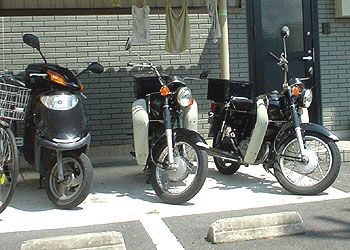 | スーパーカブ 従来主力であった黒いビジネスバイクに変わり、交番バイクの主力として活躍する白いスーパーカブ。 最近110ccエンジンを載せた新型車が発売されたが、今のところ私の近辺では、90ccの旧型車しか確認していない。 | |