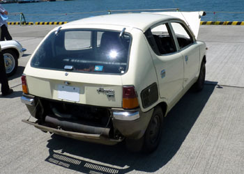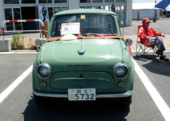 | 三菱500 博物館以外で見たのは初めての三菱500。 写真では簡素なデザインで小さいイメージがあったが、実車単体で見ると、想像以上に大きめなサイズで、ボリュームのあるデザインに見えた。 外車みたいだね。 旧タイプのナンバープレートがたまらなく渋い。 | |