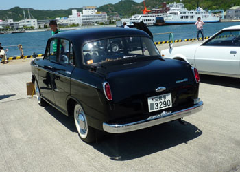 | ブルーバード これまた年代がかったナンバープレートが、とてもまぶしいクルマ。 その形から、柿の種などと呼ばれるテールランプも可愛らしい。 | |