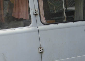 | カタログのページで一度書いているが、コンマースの左側扉は、助手席扉と後席扉(荷物室)のヒンジがBピラーの同じ位置についている。 これでは両方の扉を空けたときに、扉同士がゴッチンコしてしまいそうな気がするのだが、何らかの対策がとられていたのだろうか。常識的に考えると、ストッパーの様なものが付いていたのだろうが、外側から観察しただけでは今ひとつよく分からなかった。 ちなみに同じくBビラーに前後扉のヒンジが付いている日野ルノーでは、下側ヒンジに板バネ状のストッパーが付いていて、扉を全開にしても板バネで跳ね返されるような状態となって、ドア同士が衝突しない様になっていた。(上写真の右側) これを確認できたのは、同じ博物館で展示してある日野ルノーの実車で。 この博物館は、展示してある実物に触ることができる、非常に面白い博物館です。 | |