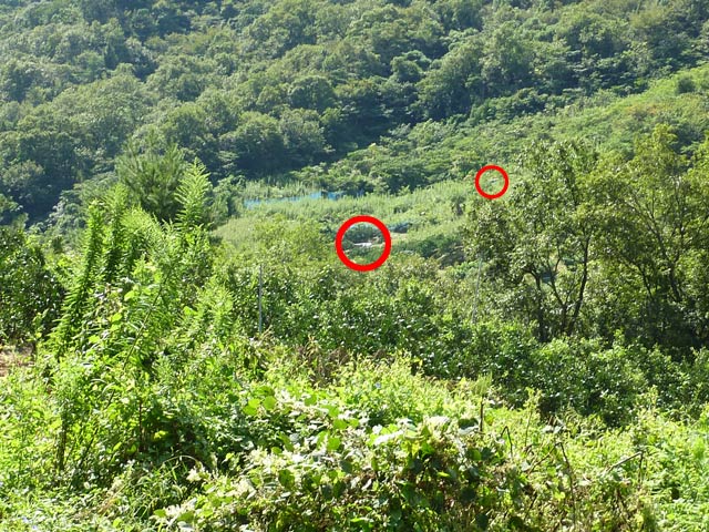 | ということで、左側赤丸のところまで到達。 比較的ポピュラーな存在である、ミニキャブワイド55の箱バンでした。 この時期の軽バンでは、廃車体として一番よく見かけるモデルであると思う。 で、とりあえず一台目は無事確保したわけであるが、2台目は想像以上の苦戦を強いられることに・・。 というのも、ここから先は踏み分け道さえないような状態で、しかも生い茂った木で姿さえ確認できない状況下、ヤマカン状態で位置を見定め、がむしゃらに潅木を掻き分け進んでゆく・・。 |