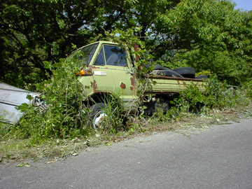 こちらは、セミキャブのクラフトらしきトラック。 1970年代以降に販売されていた、角目のクラフトはそこそこ見かける機会もあり、記憶にも残っているが、タイタンと比べると圧倒的に小数派で、残存数も極めて少ない。 記憶にある塗装色は、このウグイス色のみ。 先にお断りしたとおり、確たる証拠があるわけではないが、タイタンと共通の色ではないかと思う。 現車は、製材工場で使われていたクルマらしく、長年敷地の端で放置されていたが、もろに工場敷地内ということで、近づいて撮影する勇気もなく、残っている写真は、遠くから捉えた数枚のみ。 その後に撤去されてしまったで、もう会うこともかなわない。 |